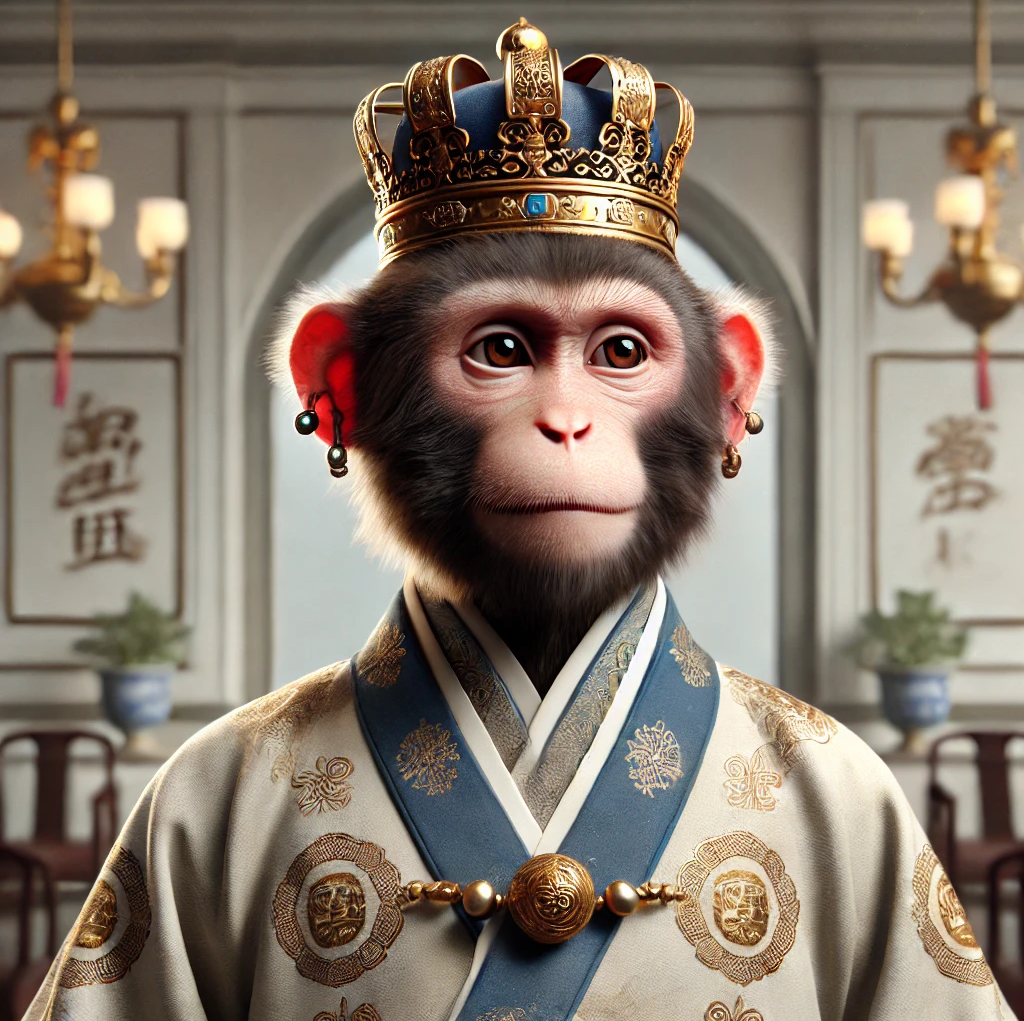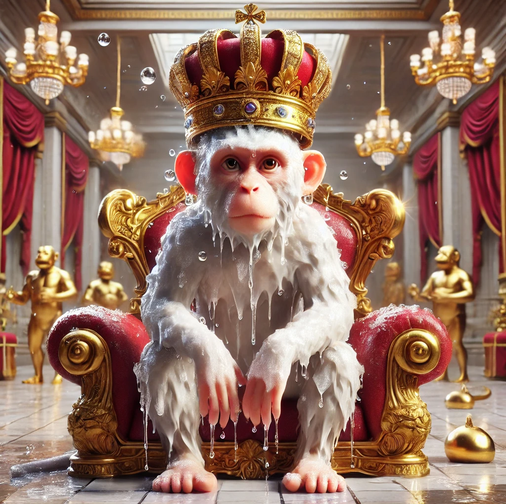 물폭탄을 맞은 원숭이가 왕좌에 왕관을 쓰고 앉아 있는모습