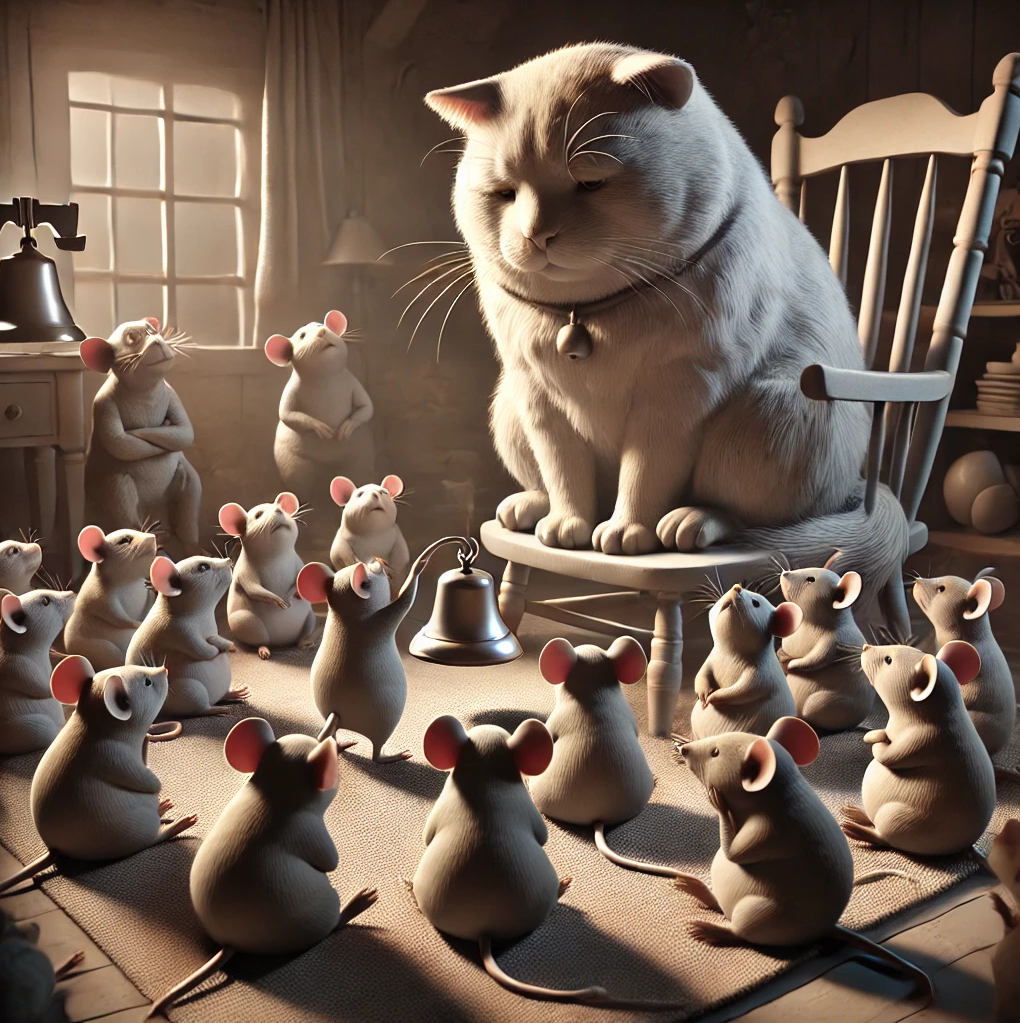 한 무리의 쥐들이 고양이의 위협을 피하기 위해 회의를 열고,