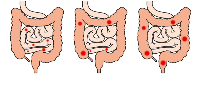 크론병에서는 입에서 항문까지 어느 소화관에서도 염증을 일으킵니다. 주로 소장과 대장에 염증이 생기는 경우가 많아
