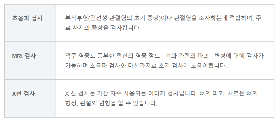혈액검사에서는 혈중내의 성분을 조사하여 검사치로부터 건선성 관절염인지