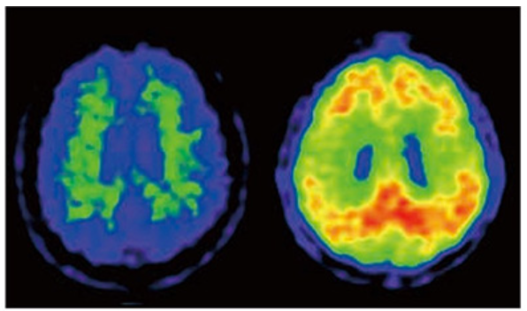 오른쪽 사진 : 정상자와 알츠하이머병의 뇌 FDG-PET